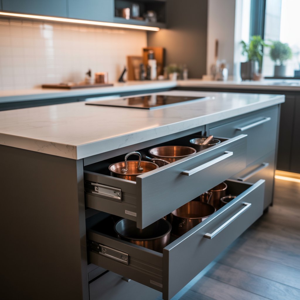 Luxury isn’t just looks; it’s function! Think deep drawers with built-in organizers, spice pull-outs, tilt-out trash/recycling bins, appliance garages, or even hidden charging stations.