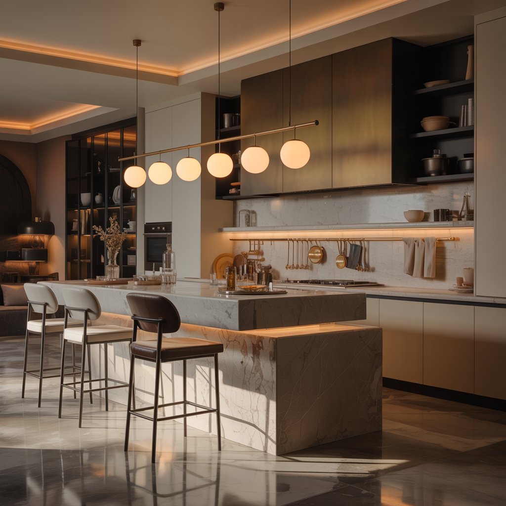 Think oversized drum shades, intricate metals, or gorgeous glass. The right lighting is like jewelry for your island – it elevates everything.