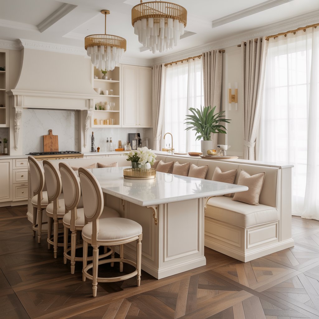Banquettes built right into the island base? Comfy upholstered seating integrated seamlessly? Or maybe just elegant counter stools that feel like part of the design?
