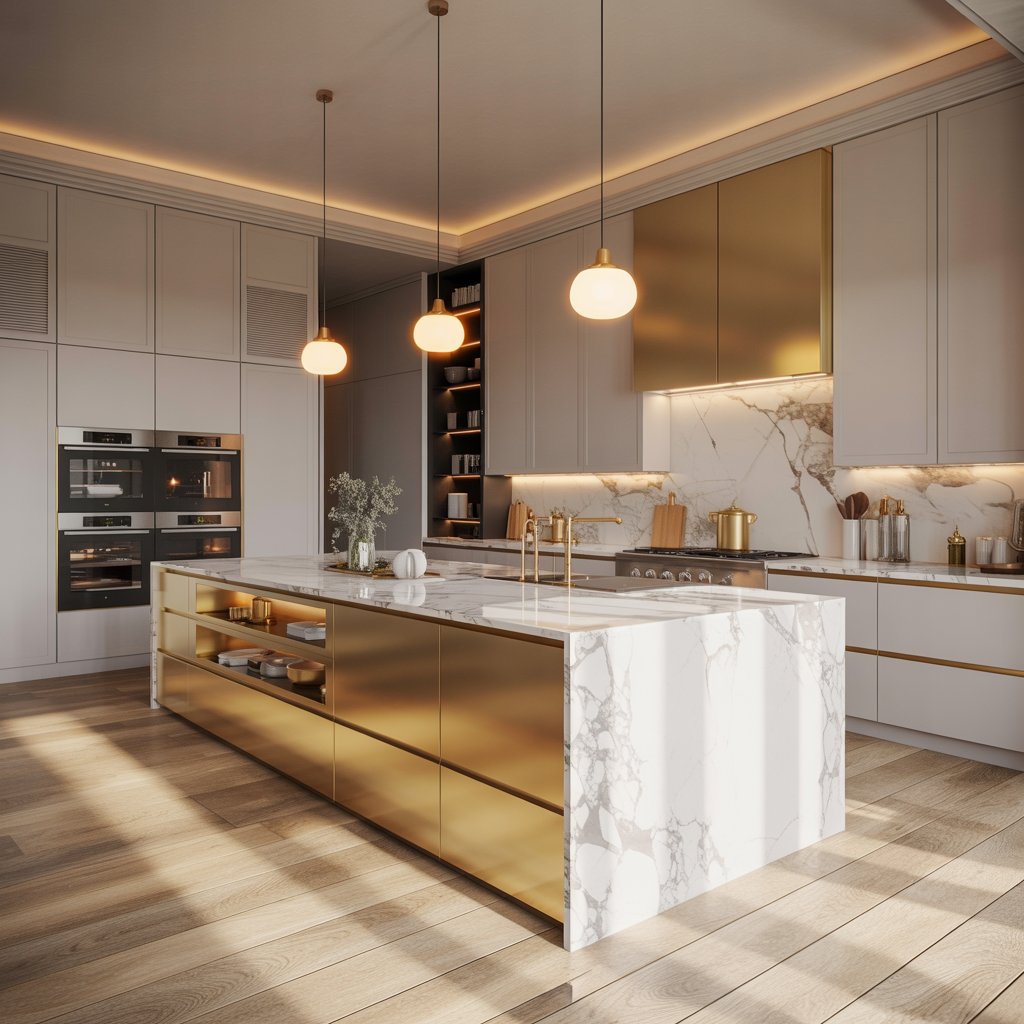 Warm metals are still king for luxury touches. Think brass or gold hardware on drawers and cabinets.