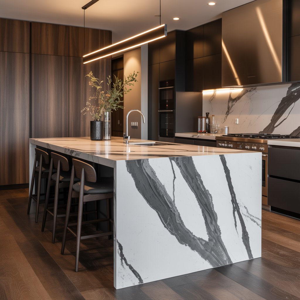 It cascades dramatically down the sides of the island, hitting the floor with serious impact. This seamless flow creates an ultra-modern, sculptural look. It’s pure, uninterrupted luxury.
