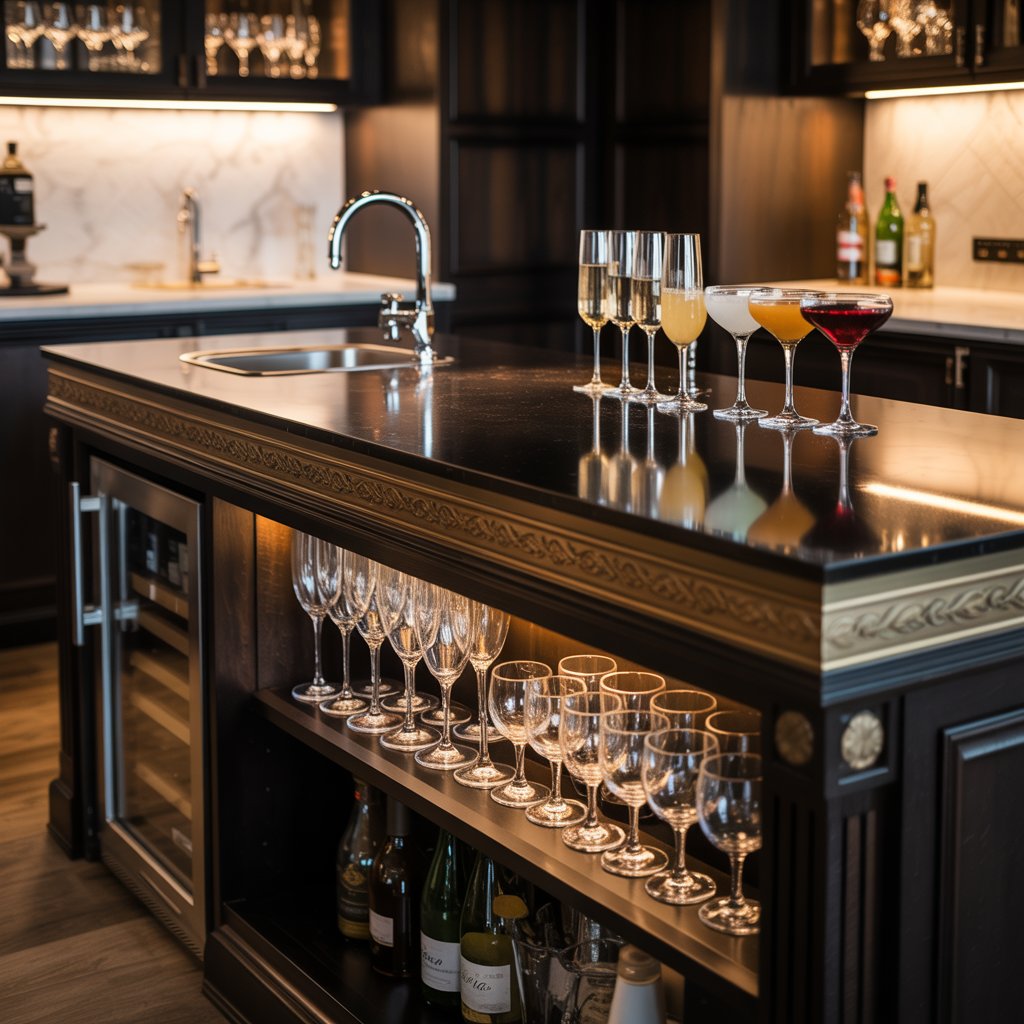 Equip your island with the essentials for entertaining: a small sink, undercounter beverage fridge, ice maker, and elegant glass storage.
