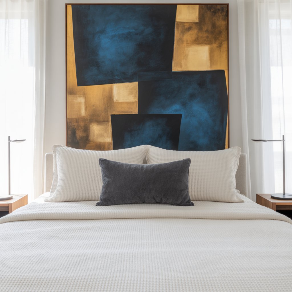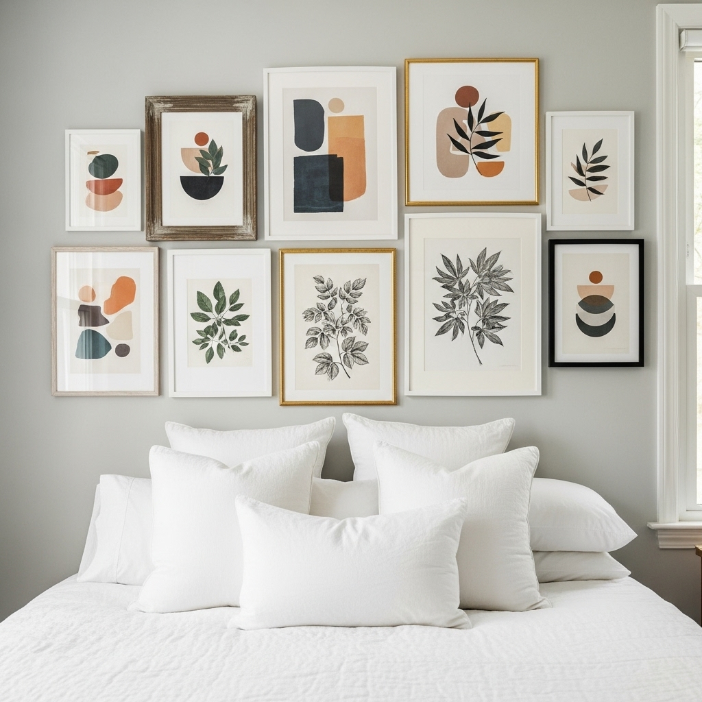 Ditch the random posters. Choose pieces you love and hang them intentionally. Gallery walls are great, but so is one stunning large piece. Hang art at eye level when standing or sitting in bed.