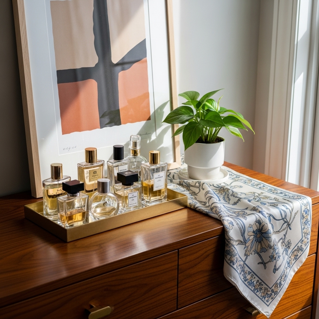 Clear the clutter! Then style it like a pro: maybe a small tray for perfumes/jewelry, a medium-sized plant, a leaning picture frame, and a decorative box for random bits. Keep it minimal but intentional.