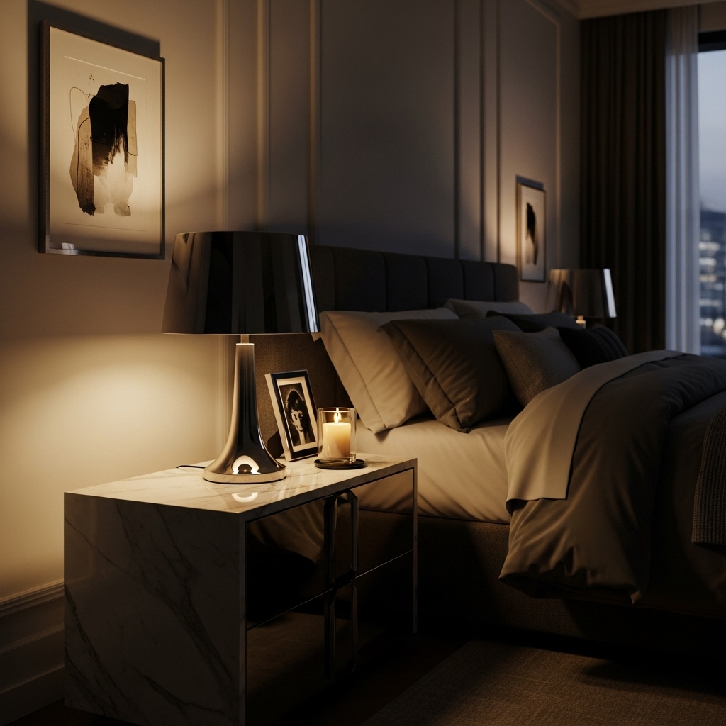Keep surfaces mostly clear (phone, book, glass of water – essentials!). But add one or two small decorative touches: a tiny plant, a cool rock, a small framed photo. Style matters, but so does not knocking stuff over in the dark!