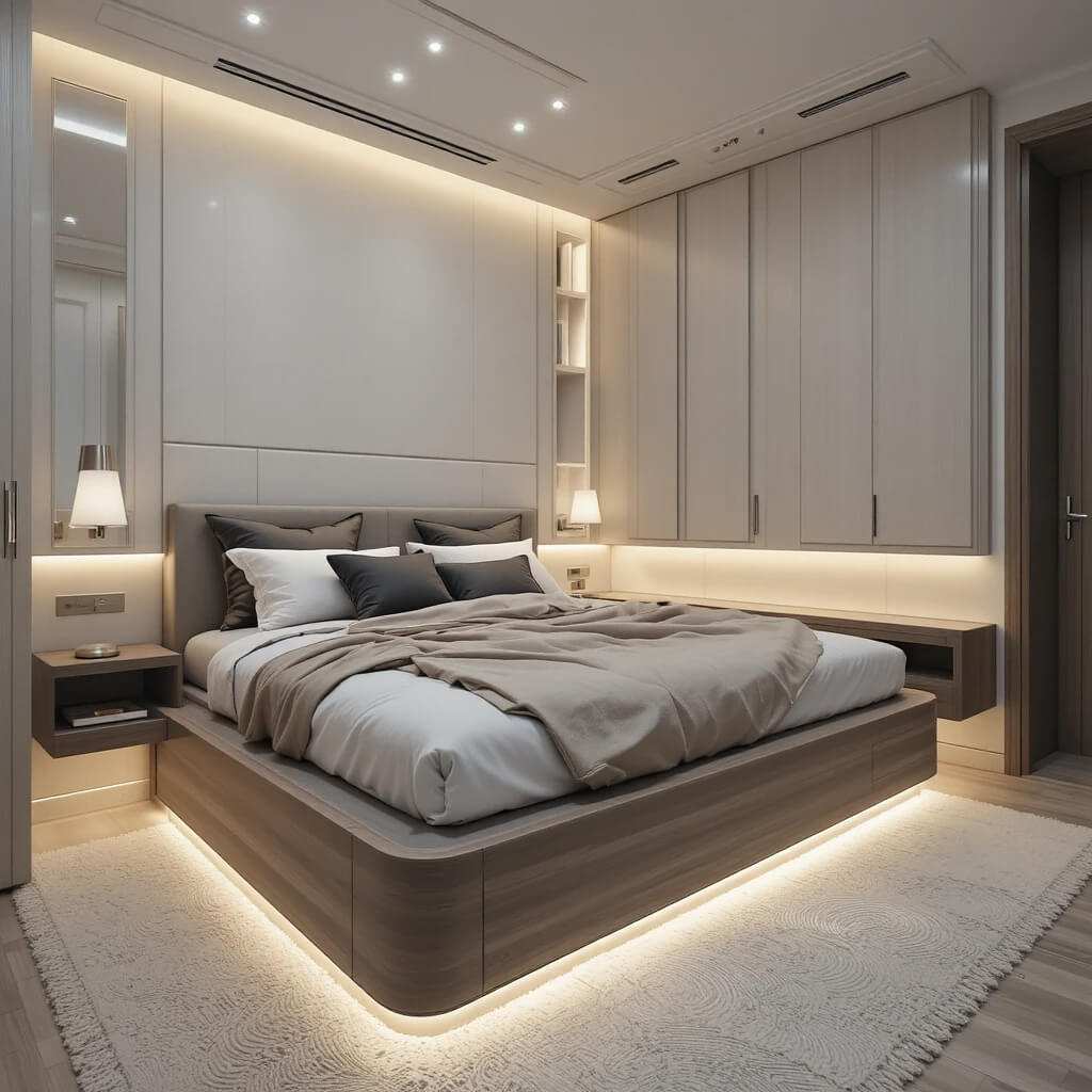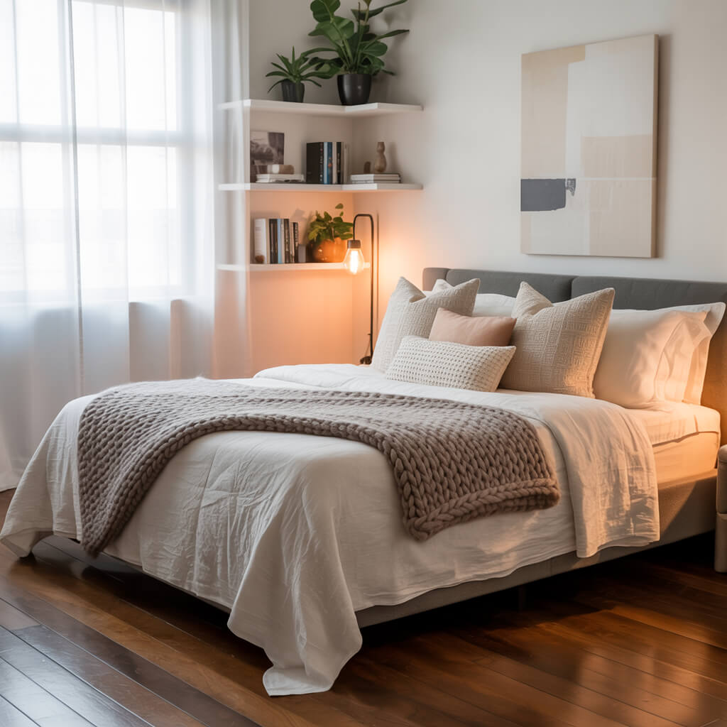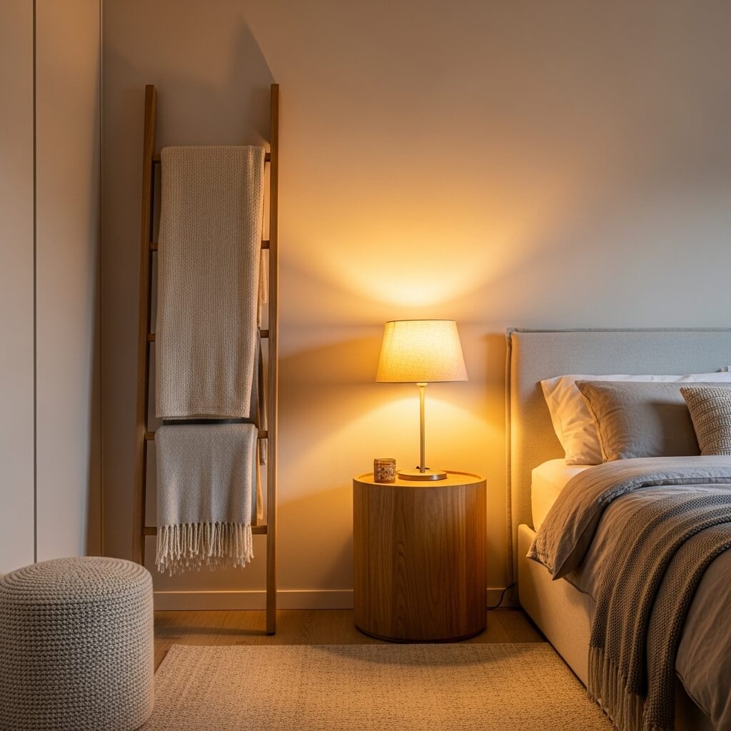 Ditch the bulky nightstand if it’s eating floor space. Try a wall-mounted shelf instead – holds your lamp, book, and phone just fine.