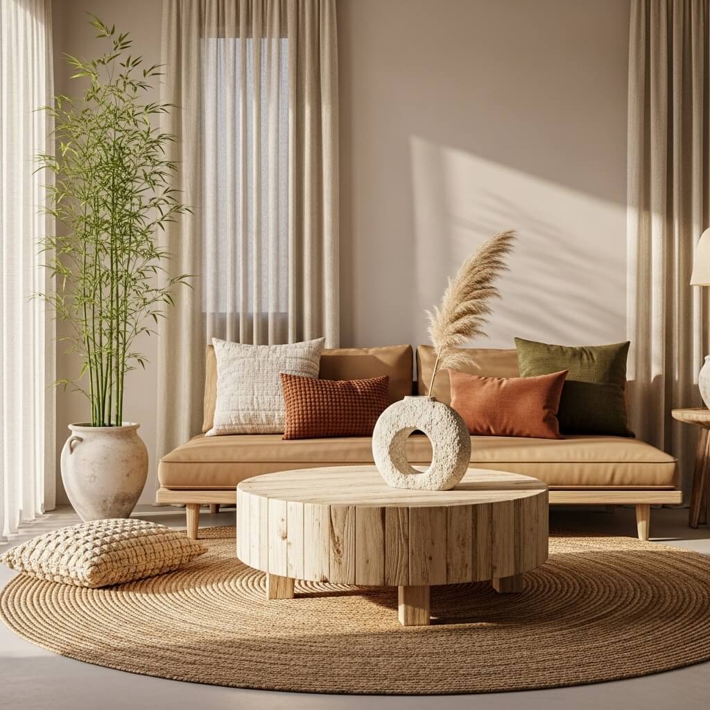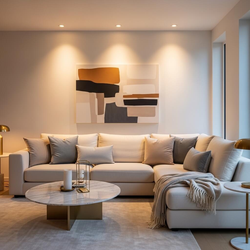 Think creamy whites, soft greys, warm beiges, or earthy tones for your big surfaces: walls, sofa, rug. This instantly creates a calm, airy feel and acts like a blank canvas.