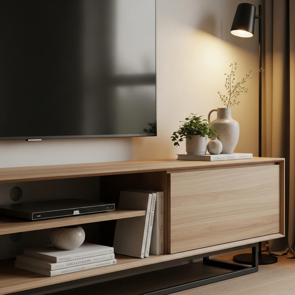 Nothing kills a clean vibe faster than a rat’s nest of cords snaking from your TV or behind the console. Use cord sleeves, clips, boxes, or even run them inside the wall. Tuck away power strips. It’s the ultimate finishing touch.