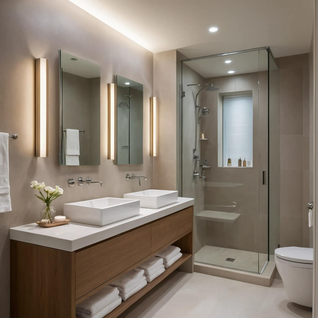 Harsh overhead lighting alone casts shadows and feels cave-like. Layer your lighting: overhead for general light, wall sconces by the mirror for task lighting, and maybe even niche lighting.