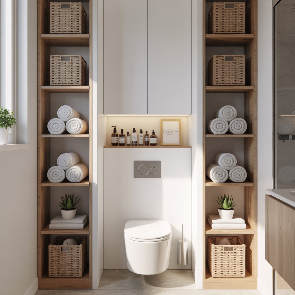 - FYI: Baskets or bins on open shelves keep clutter hidden but accessible. Because nobody wants to see your backup TP stash, right?