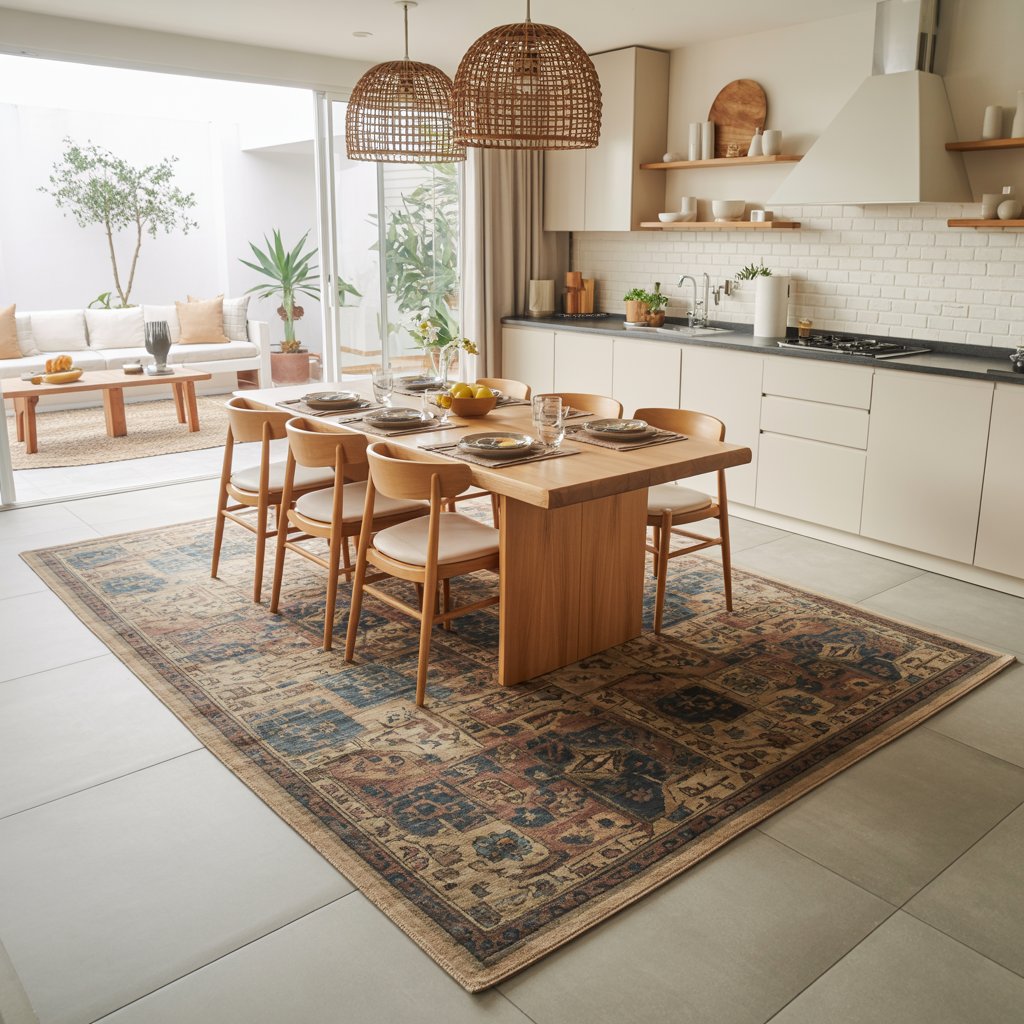 Hear me out! A large, durable, easy-clean rug placed strategically under your dining table or island seating area works wonders. It visually anchors that specific zone within the larger open space.