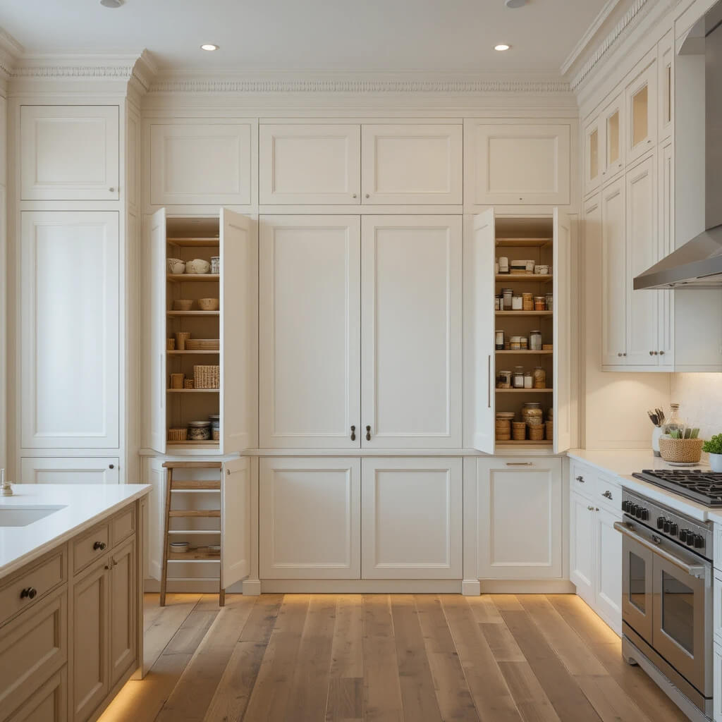 When footprint space is limited, look up! Tall, floor-to-ceiling cabinets maximize every inch. Use them for pantry items, appliances you rarely use, cleaning supplies, or even integrated laundry if you’re clever.