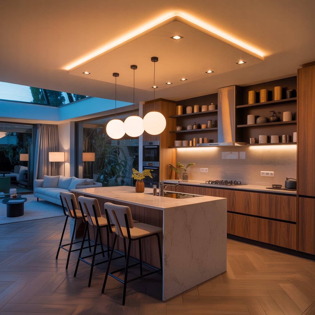Combine recessed downlights for general ambience, striking pendants over the island for drama, under-cabinet LEDs for task lighting, and maybe some floor lamps in the lounge area.