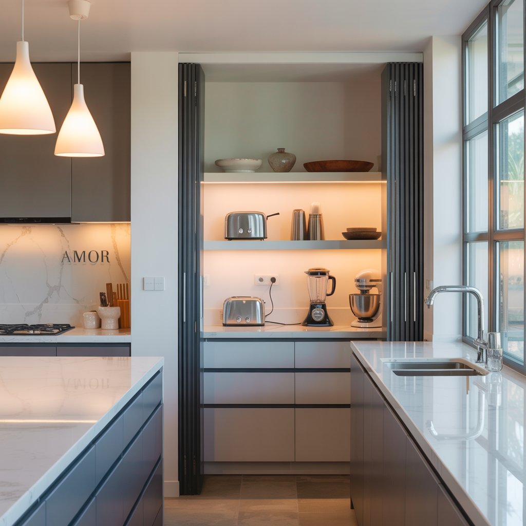 Love open plan but hate the idea of your morning cereal chaos being the first thing guests see? Create a smaller, dedicated prep zone – maybe a butler’s pantry or a super-organized corner cabinet with pocket doors.