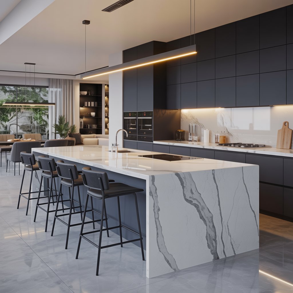 Go big, go bold – think waterfall quartz edges, unexpected materials like concrete or rich wood, or even a contrasting color that pops.
