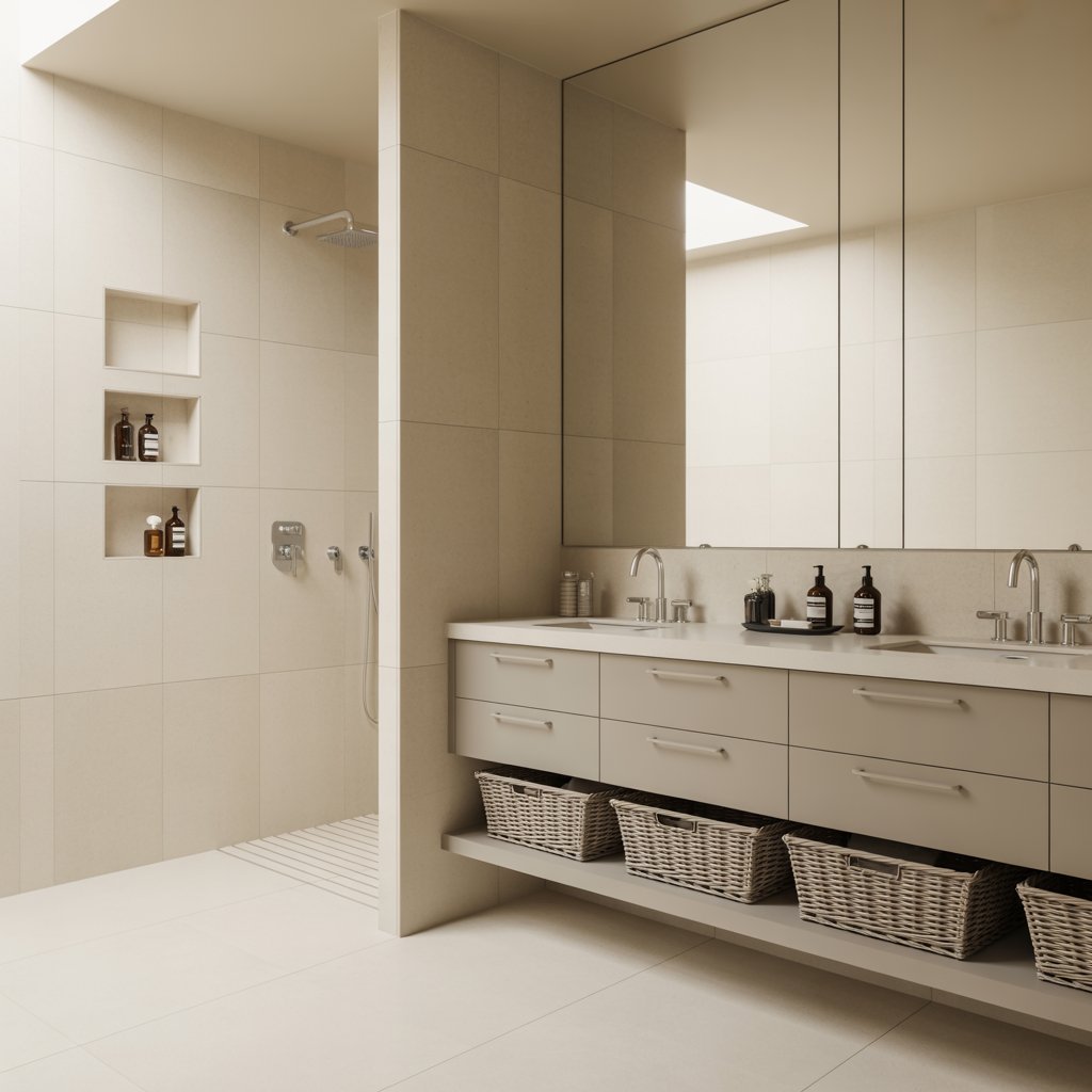Spa bathrooms are serene, not covered in half-empty product bottles. Ample, hidden storage is crucial.