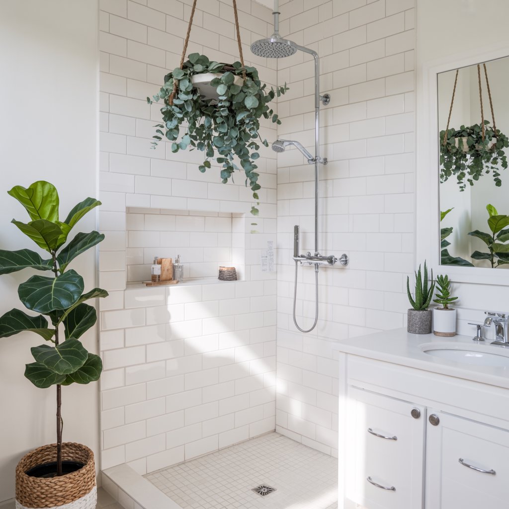 A fiddle leaf fig in the corner, some eucalyptus hanging in the shower, or a simple succulent on the vanity works wonders. Plants = instant happy vibes.