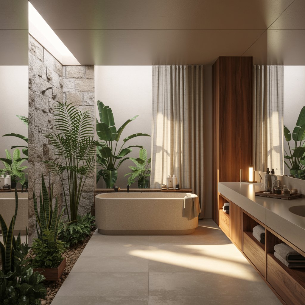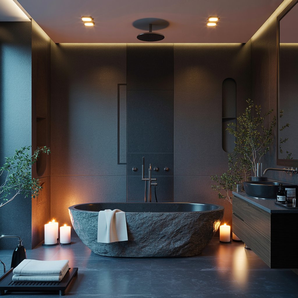 Think stone, wood, bamboo, rattan. These textures scream serenity and connect you to nature – key spa vibes. Swap plastic accessories for a teak stool, add stone soap dishes, or incorporate bamboo towels.