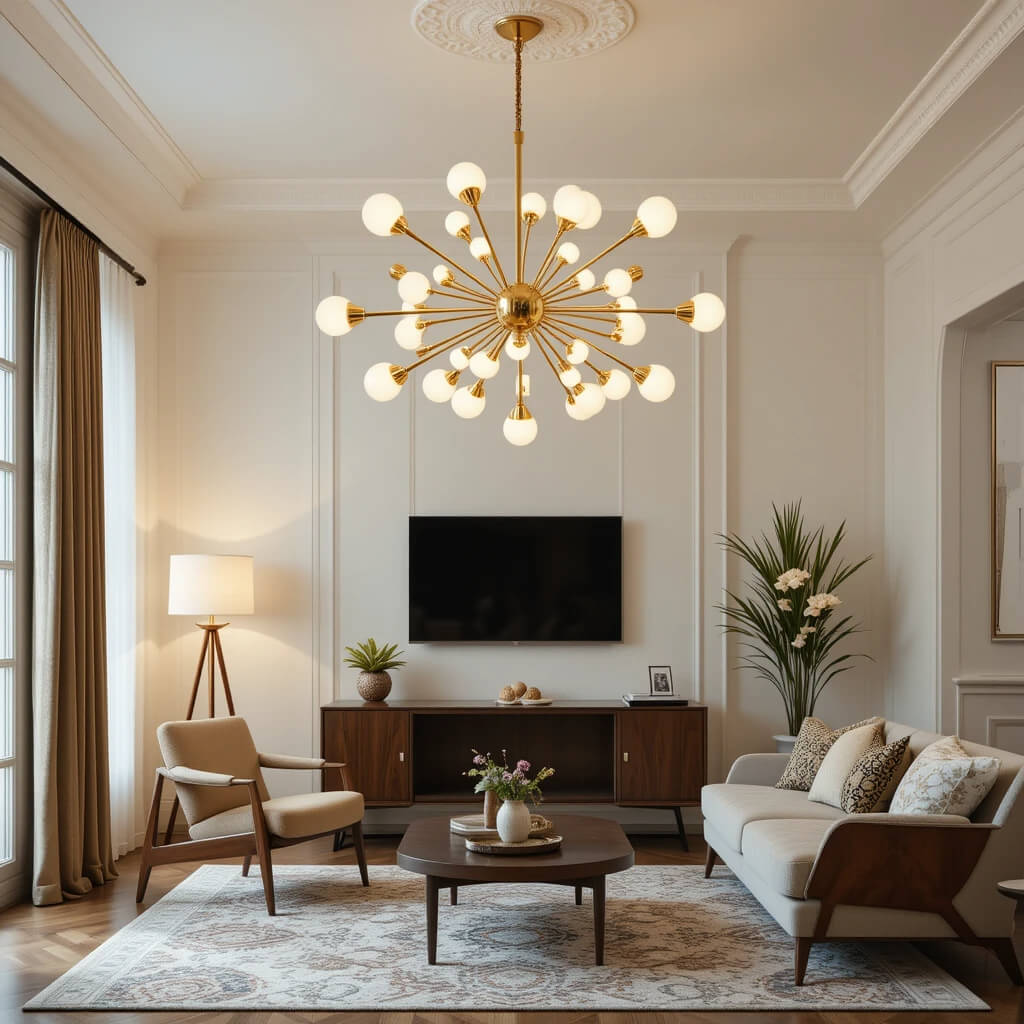 Swap the boring boob light for a statement piece. Think Sputnik chandeliers, geometric pendant lights, or sculptural floor lamps with tripod bases.