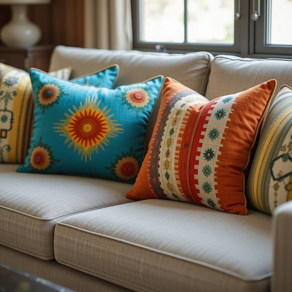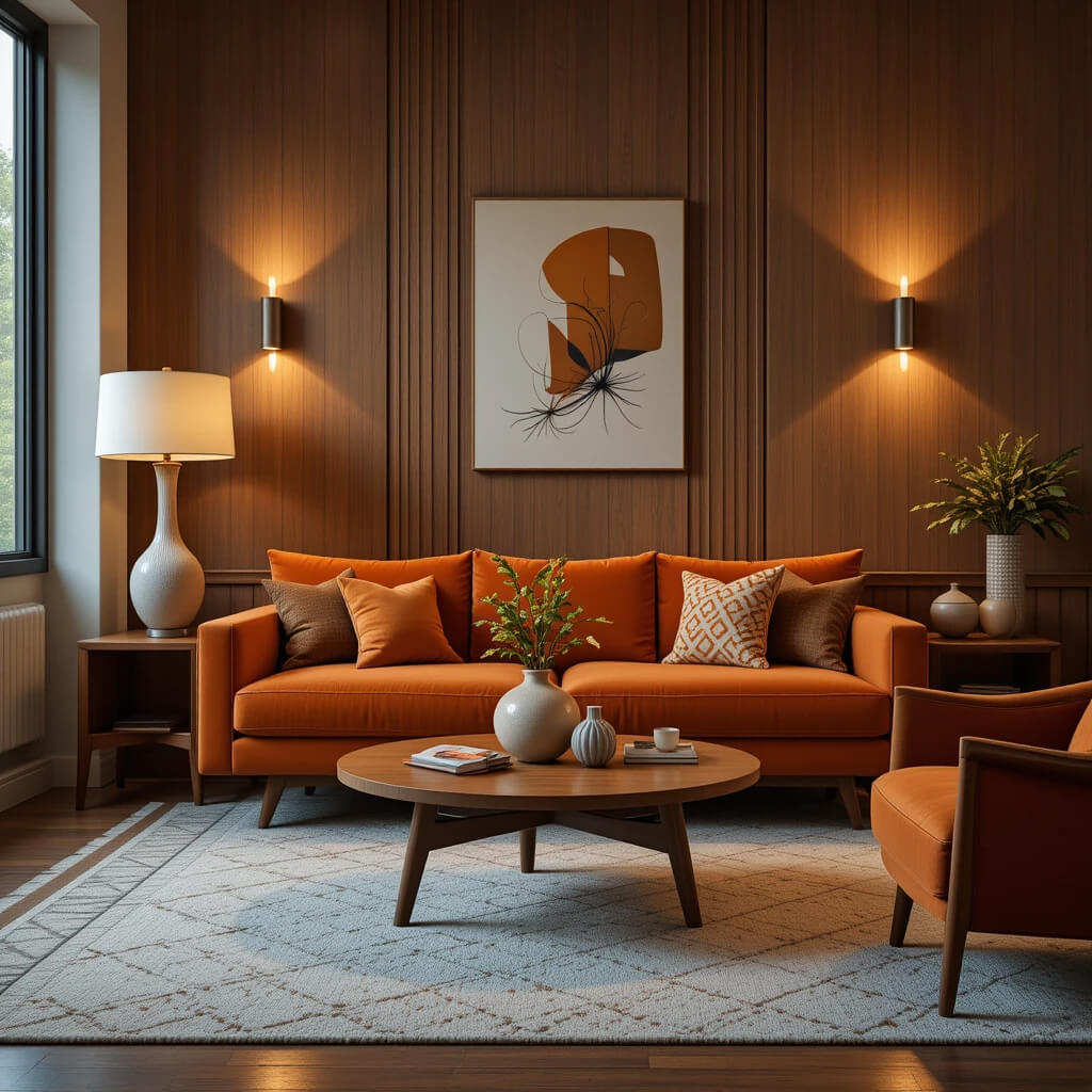 Inject pops of color and pattern with accent pillows. Stick to MCM-inspired prints: abstract shapes, atomic motifs, simple stripes, or solid bold colors like orange, avocado, or turquoise. Mix sizes and textures for interest.