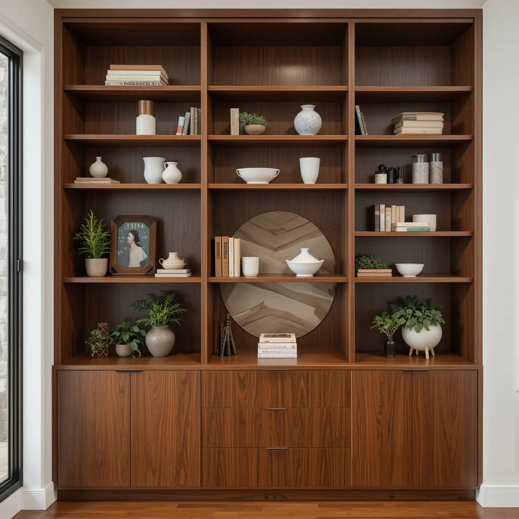 If you have the space (or are renovating), consider sleek, low-profile built-in shelving or cabinets. Use them to display curated collections of books, ceramics, or vintage finds. Leave some open shelving – it’s not about hiding everything.