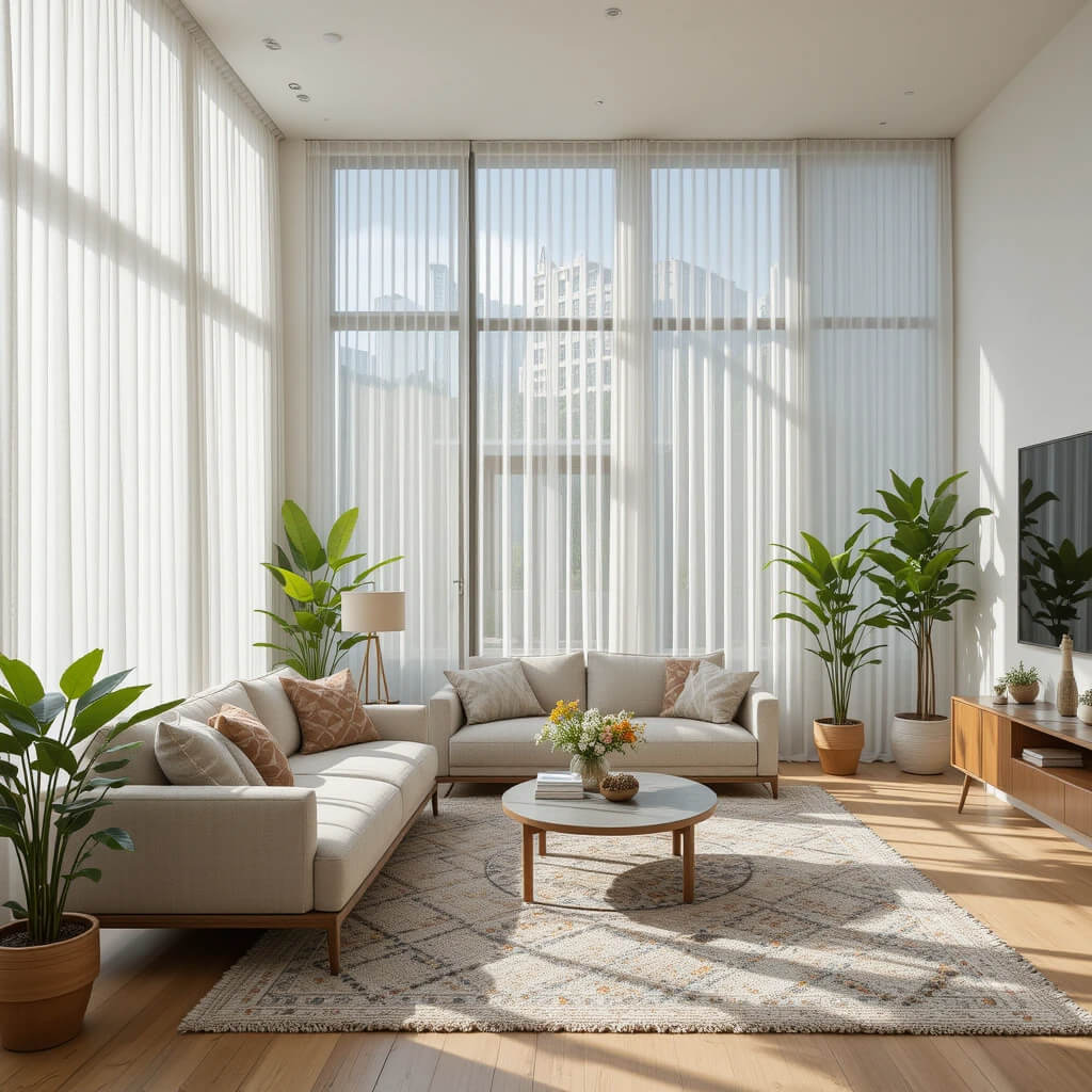 Let the light flood in! Opt for minimalist window coverings. Think clean-lined Roman shades in a neutral fabric, sheer curtains hung high and wide, or even just leaving windows bare if privacy allows.