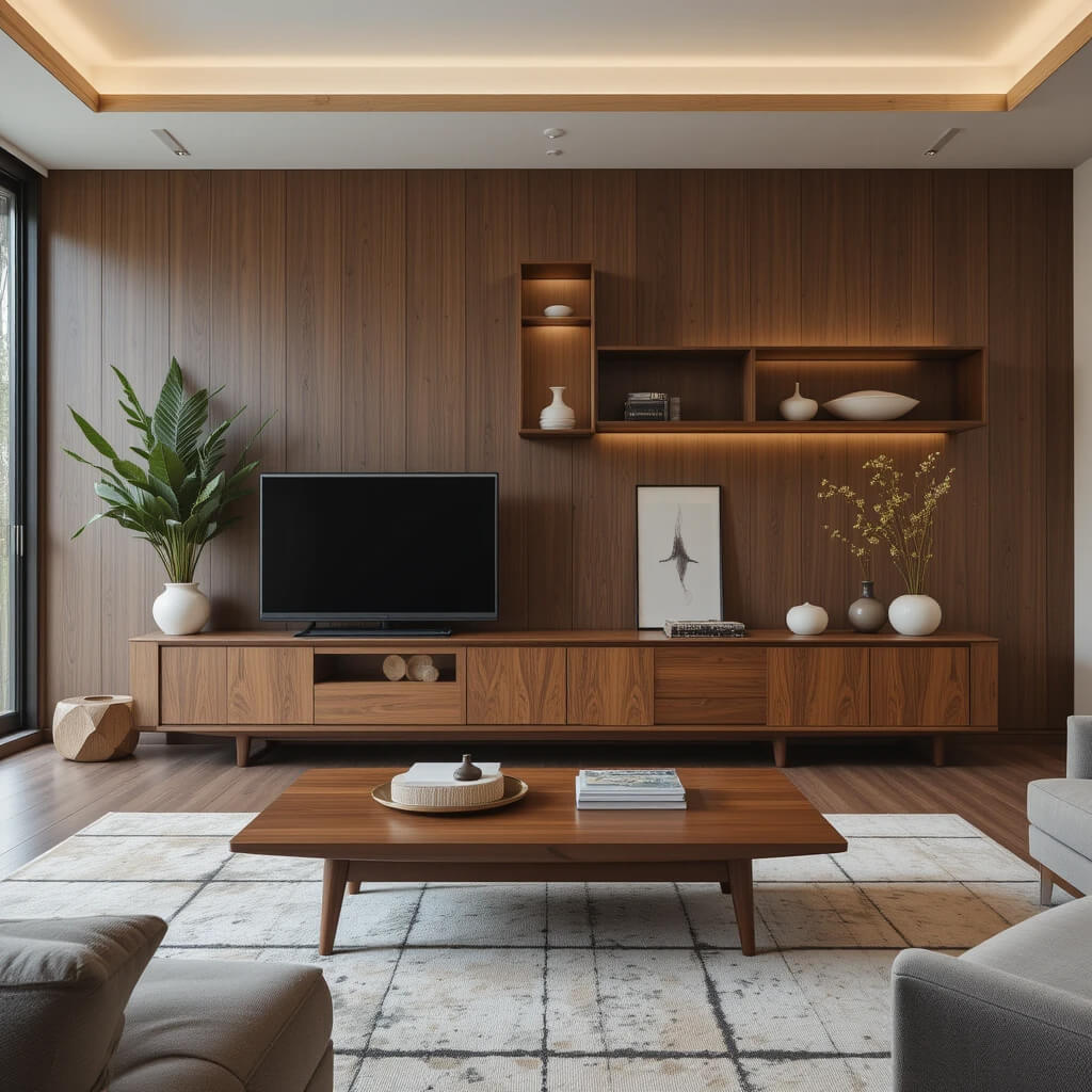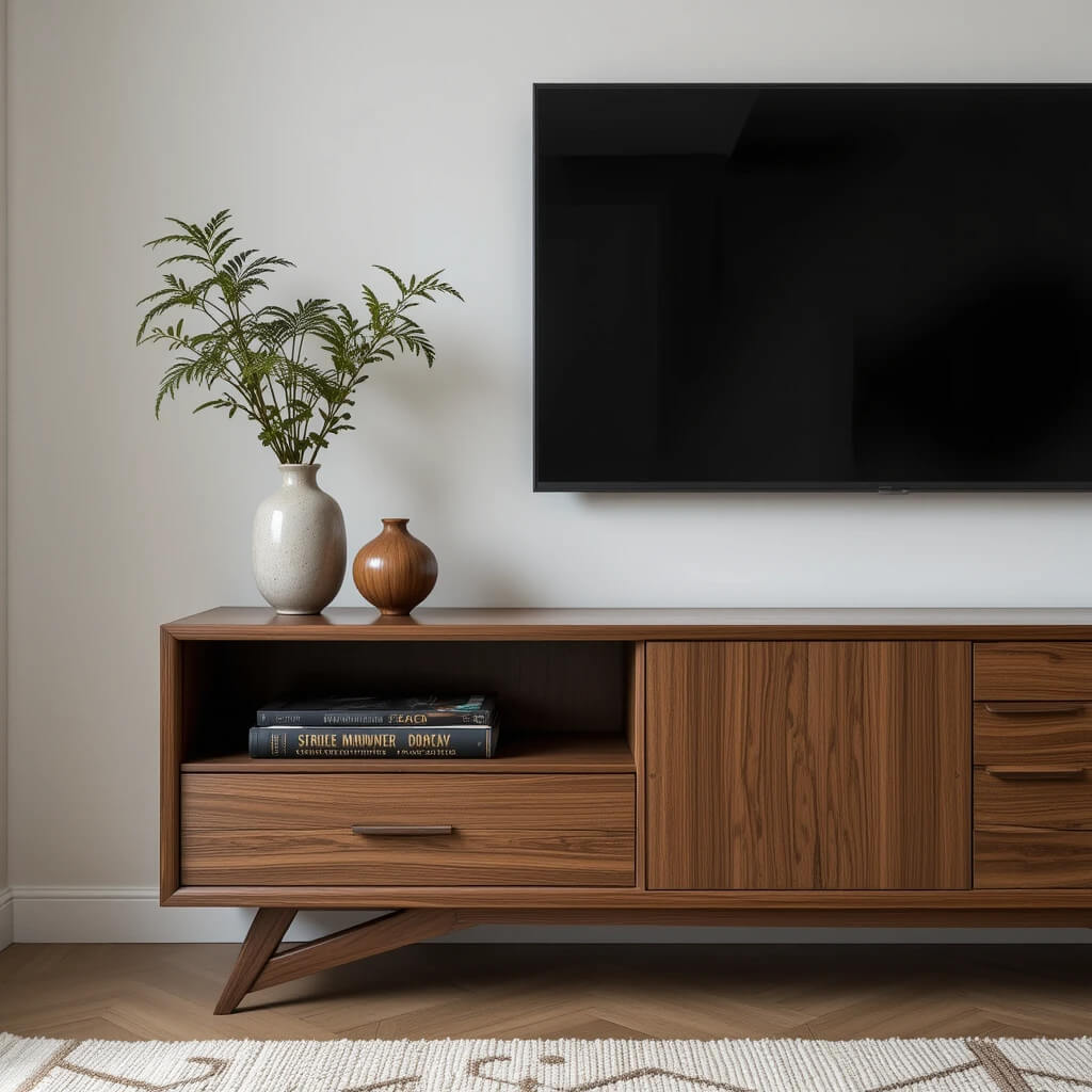 Hide the tech clutter! Opt for a sleek, low media console with ample closed storage. Think wall-mounted TVs (if you must) or integrated solutions that prioritize the furniture, not the gadgets. Wires are the enemy – vanquish them.