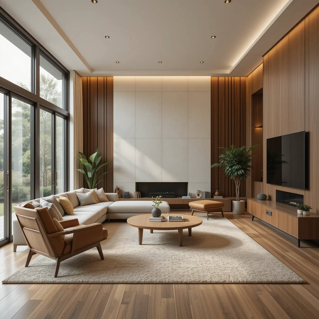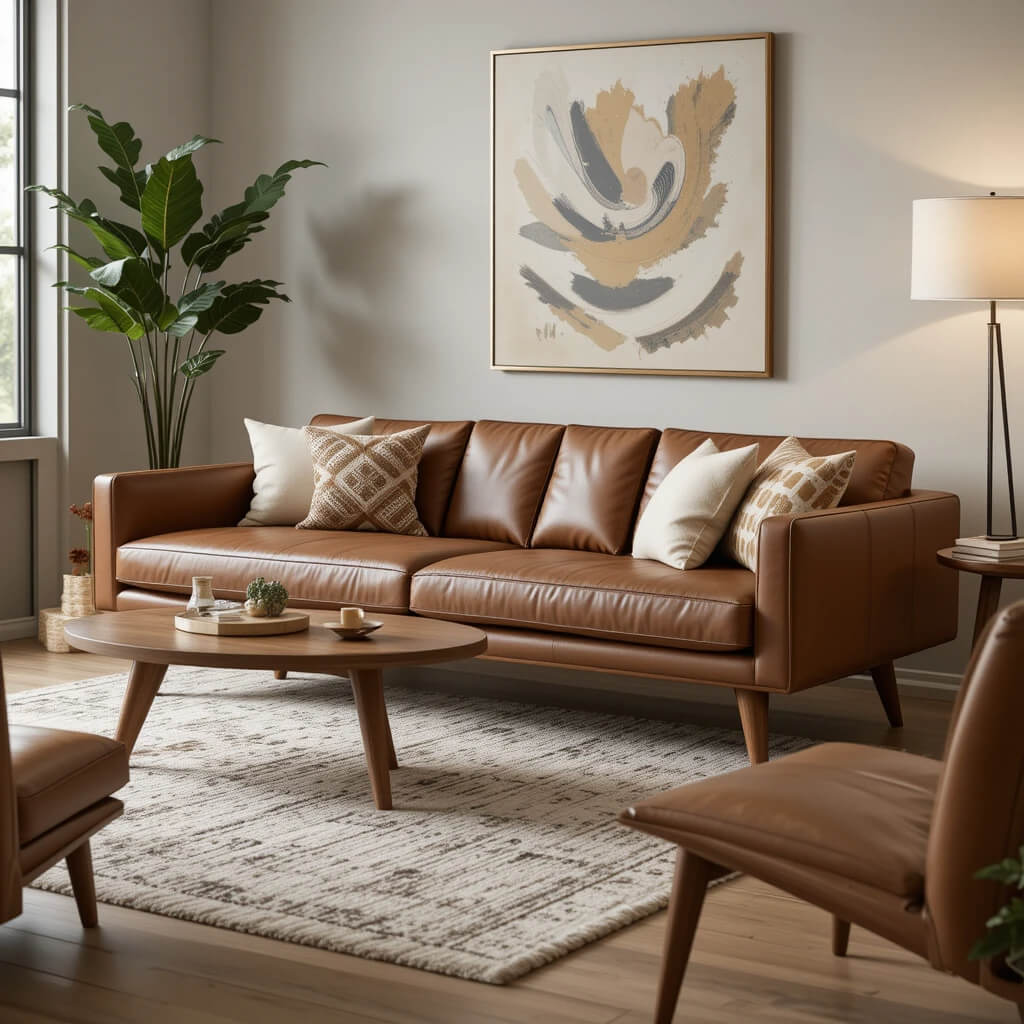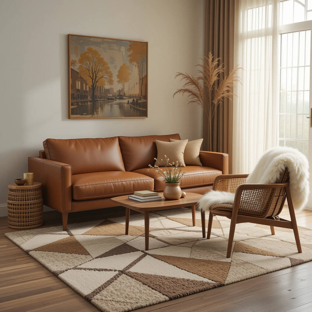 Prevent “flatness” by layering textures. Smooth leather sofa + nubby wool rug + sleek wood + woven rattan side table + maybe a shaggy pillow. It adds depth and keeps the clean lines from feeling cold. Think tactile and inviting.
